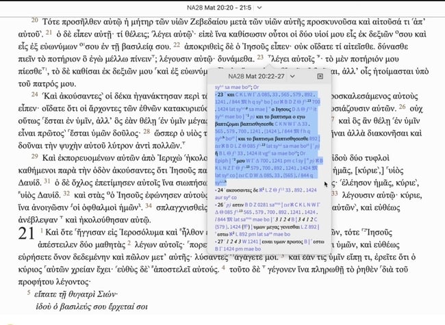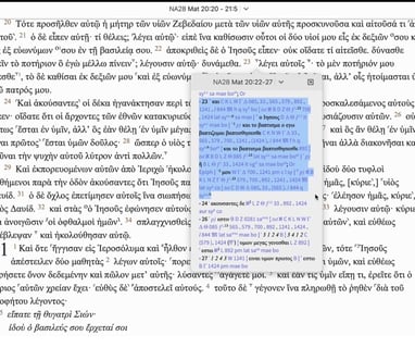On this picture you have a snapshot of this text, called NA28 (short for Nestle /Aland version 28) – looking at Matthew 20:23. Take a closer look at the blue highlighted area. The black greek words are the greek words the Text Critics have selected. Arbitrarily, based on their own made up guidelines. The blue numbers, letters or symbols refers to the Manuscripts they have selected for their support.