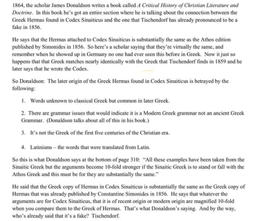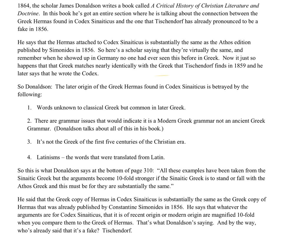 Codex Siniaticus contains a Letter named “The Shepherd of Hermas” (which is not canonical – why is it even there?) and this Letter is part of the Book Binding of the Codex. What is astounding is the fact that it’s impossible to be a 4th century Letter. Look at the analysis below from Pastor Brian Ross. Click on it and you get the entire document – It is a picture of page 10
