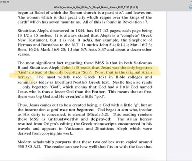Similar to Codex Sinaiticus, Codex Vaticanus identifies itself as a product of gnostic corruption in John 1:18, where “the only begotten Son” is changed to “the only begotten God,” thus perpetuating the ancient Arian heresy that disassociates the Son of God Jesus Christ from God Himself by claiming that the Word was not the same as the Son. John’s Gospel identifies the Son directly with the Word (John 1:1, 18), but by changing “Son” to “God” in verse 18, this direct association is broken.